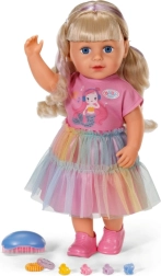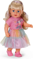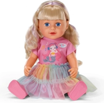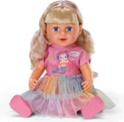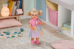 Opdag dukken BABY born Carla 43 cm med lange kvalitetsnylonhår, som er nemme at rede. Medfølger 7 tilbehør til hårstyling, dukken har bevægelige led, kan stå selv og takket være den faste krop kan hun bades i badekarret. Looket fuldendes af en sød T-shirt, regnbuefarvet tylskørt og lyserøde sko – perfekt til kreativ leg og hårstyling.