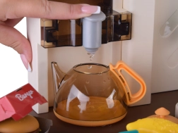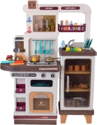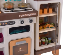 Dette rummelige legekøkken passer flot i børneværelset eller legehjørnet og bringer med sine realistiske funktioner madlavningens verden tættere på børnene. Det interaktive blus tilbyder to tilstande – kogelyd med lysende LED eller dampeffekt (røg) med lyd. Der er åbnbar ovn, skabe, bevægelige urvisere og vandinator til at fylde i koppen, samt en pumpehane til rigtigt vand.