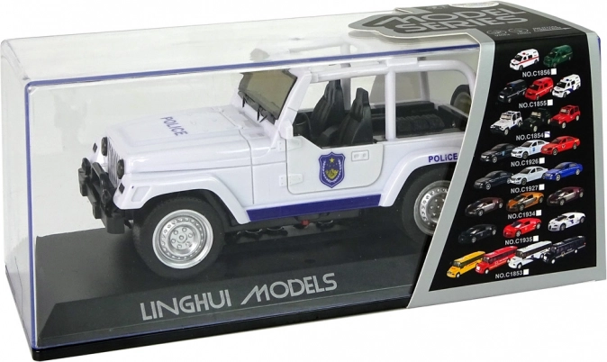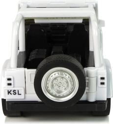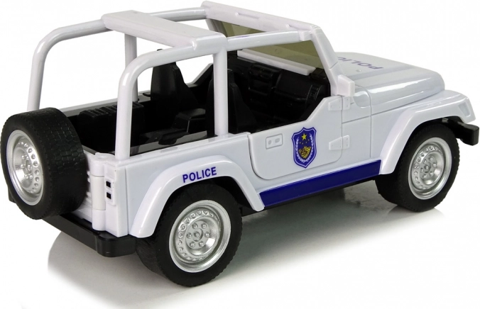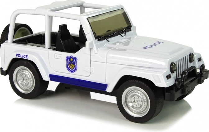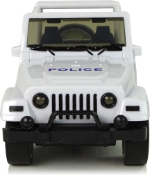 Bliv lovens vogter og kør ud på mission! Den hvide terrænpolitibil er det perfekte valg til børn, der elsker action og eventyr. De kompakte mål passer til en barnehånd, mens gummidæk og pull-back motor giver sjov kørsel over korte afstande. Bilen har åbnende fordøre, et detaljeret interiør og blå politidetaljer med påskriften POLICE.