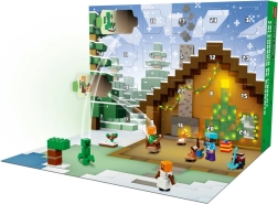 Inkluderer minifigurer som Alex med Creeper-juletrøje, Steve med vintertrøje, Creeper, drowned med trefork, stray i diamantpanser, snøgolem, zombie med fortryllet økse og en landsbyboer i julemandskostume med ovn. I alt får du 300 dele, som er kompatible med andre LEGO MINECRAFT sæt.
