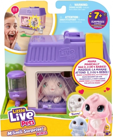 Opdag en verden af nuttede kaniner med Little Live Pets – Mama Surprise. Tag dig af kaninmoren, kæln med hende, giv hende mad og sæt hende i buret. Når du fylder vand i drikkeflasken, venter der efter cirka 60 minutter en overraskelse i form af små kaninunger. Du kan lege igen og igen og lade ungerne dukke op med det samme, når moren sættes i buret.