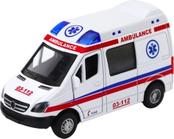 En realistisk metalambulance i skala 1:32, der glæder både små redningsfolk og samlere. Den tilbyder pull-back drev, åbne døre og lys- og lydeffekter. Kvalitetsudførelse i metal og plast sikrer holdbarhed og sikker leg, og de kompakte mål gør den nem at tage med.