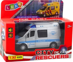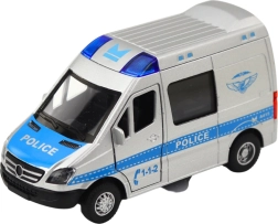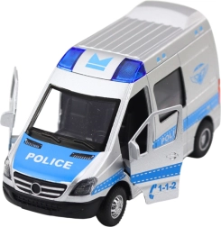 Den naturtro politibil i skala 1:32 kombinerer en metalkarosseri med slidstærk plast, hvilket gør den stabil, sikker og klar til hverdagens aktion. Træk blot bilen tilbage, og takket være pull back-drevet suser den selv fremad. Åbne døre forstærker den realistiske leg, mens lys og lyde giver den rette stemning til hver indsats.