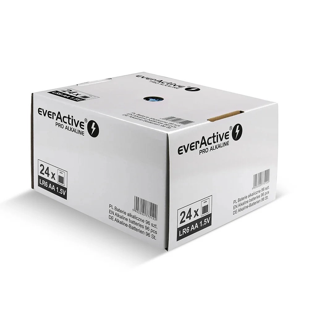 Pakningen everActive PRO Alkaline bringer det mest kraftfulde sortiment af alkaliske batterier fra everActive i en praktisk displaypakke – 24 blister med 4 stk, i alt 96 AA-batterier (LR6). Ideel til detailhandel, servicecentre, virksomheder og professionel anvendelse.