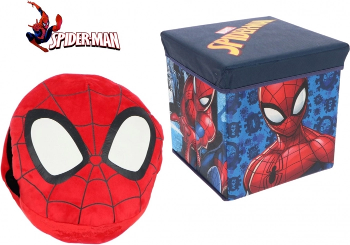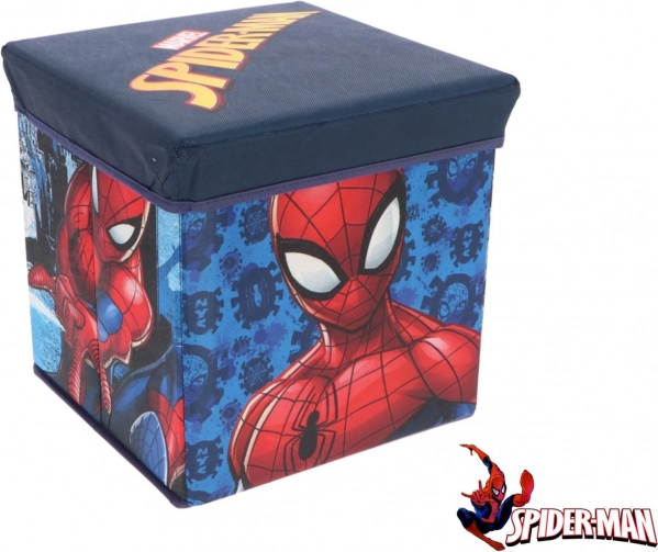 Sammenklappelig opbevaringsboks og skammel Cozy Noxxiez SPIDERMAN, 30×30×30 cm, volumen 27 l, låg bærer op til 80 kg. Orden, siddeplads og stil til børneværelset.