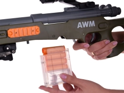 Den store snigskytteriffel til børn med skumprojektiler giver en imponerende realistisk oplevelse. Efter hver omladning falder et “hylster” ud af kammeret ligesom på et rigtigt våben, hvilket øger autenticiteten i legen. Riflen er helt i plastik, så den er meget let og ligger godt i hånden, og dermed kan børn lege i timevis.