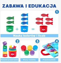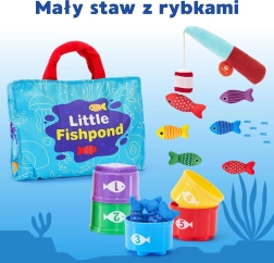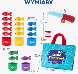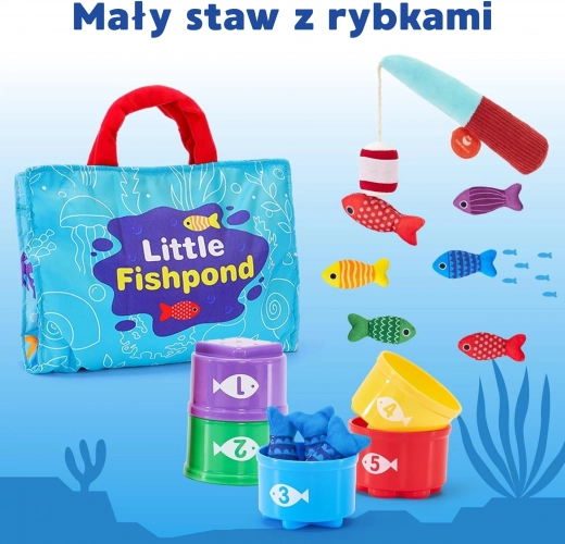 WOOPIE legesæt til små lystfiskere er en blød, sikker og fængende legetøj til børn fra 6 måneder. Farverige plysfisk, en let stang med agn med velcro, kopper–sortere med tal og en sammenklappelig taske–legeunderlag forvandler ethvert hjørne til en mini-dam. Barnet fanger fisk, sorterer dem i kopper og lærer farver, tal og mønstre, samtidig med at finmotorik og koordination udvikles.