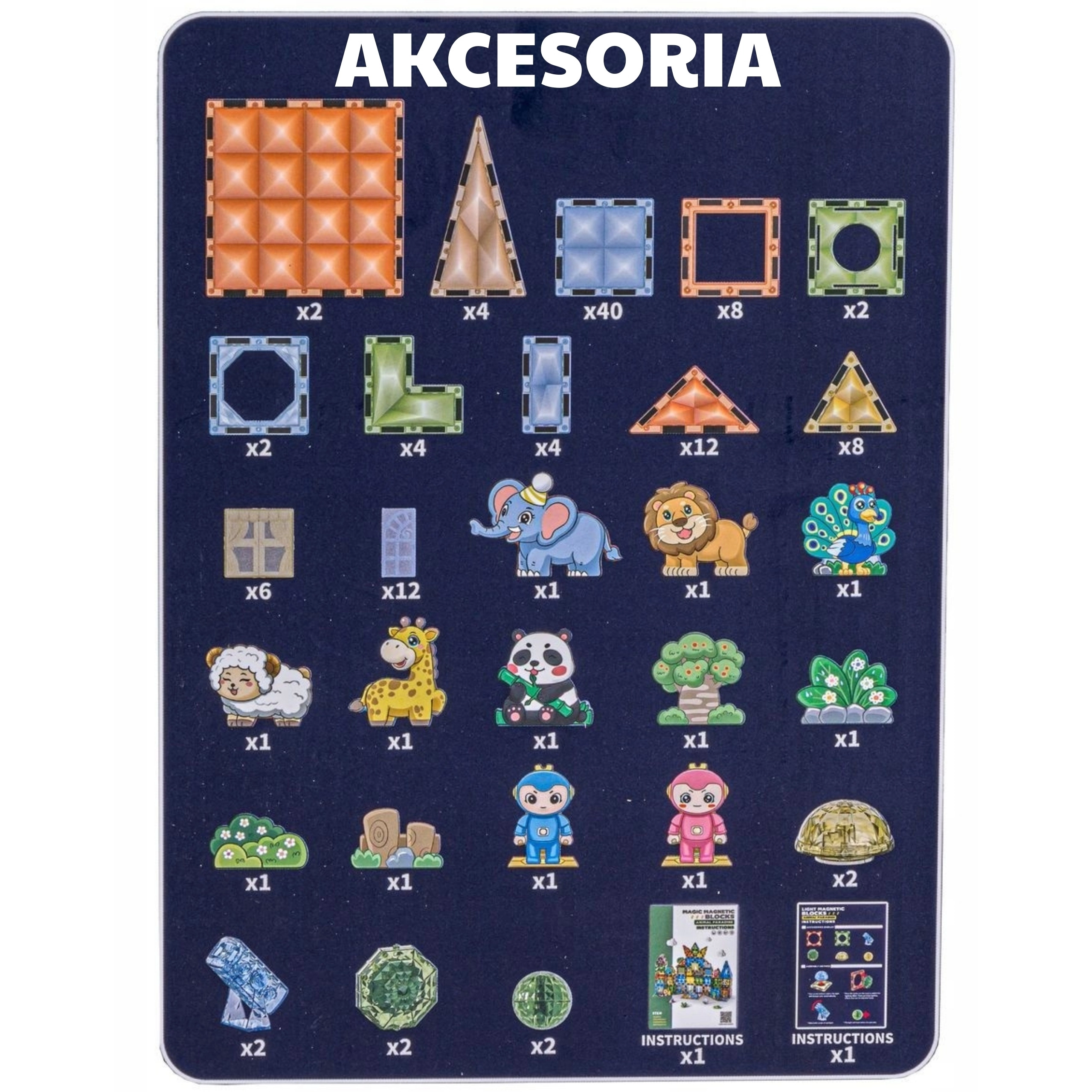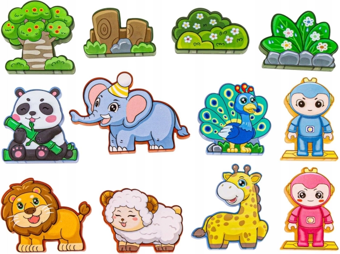 Magnetiske dele i forskellige former, dyrefigurer, karakterfigurer, tematilbehør (træ, klipper), vejledning