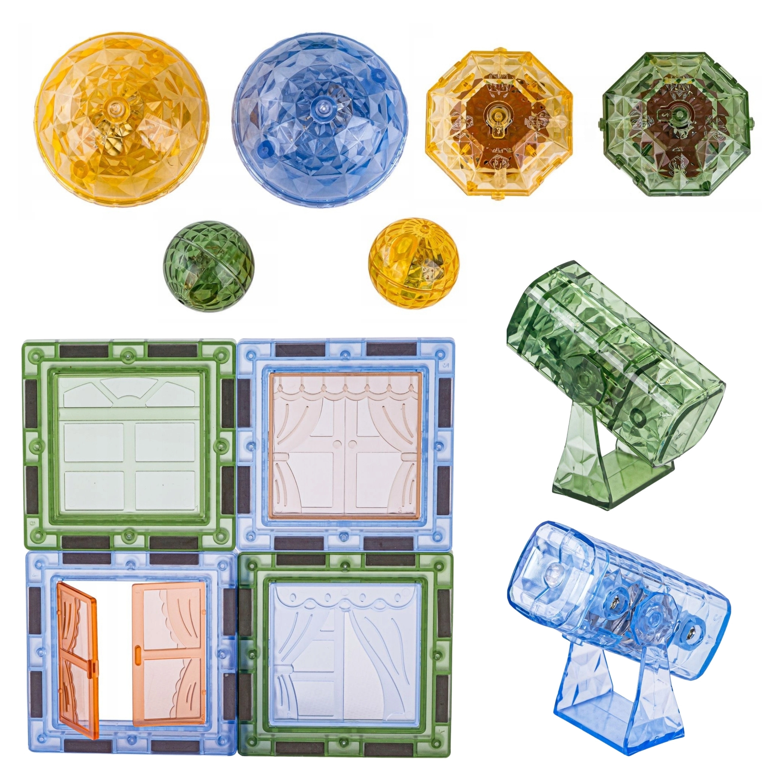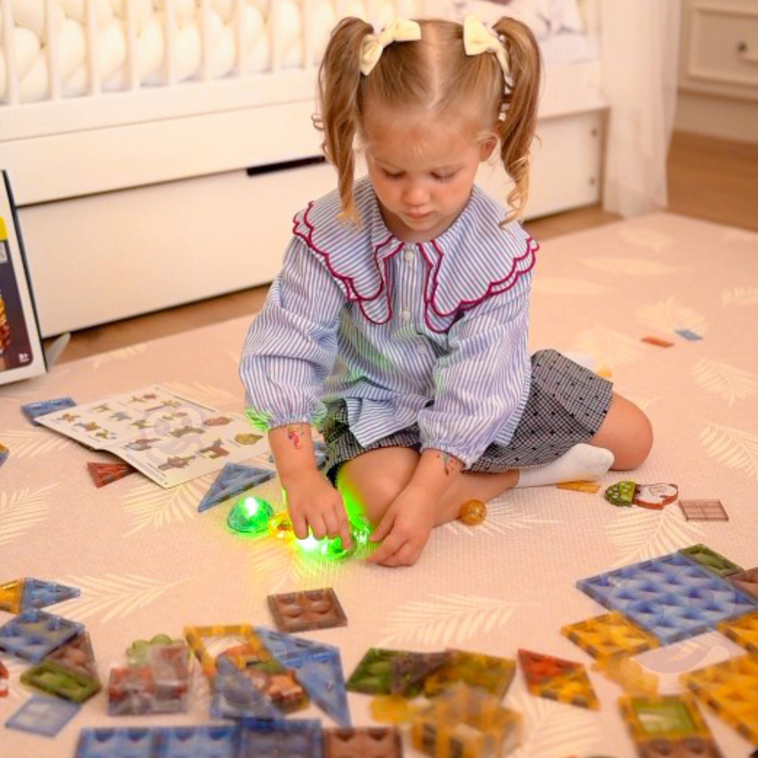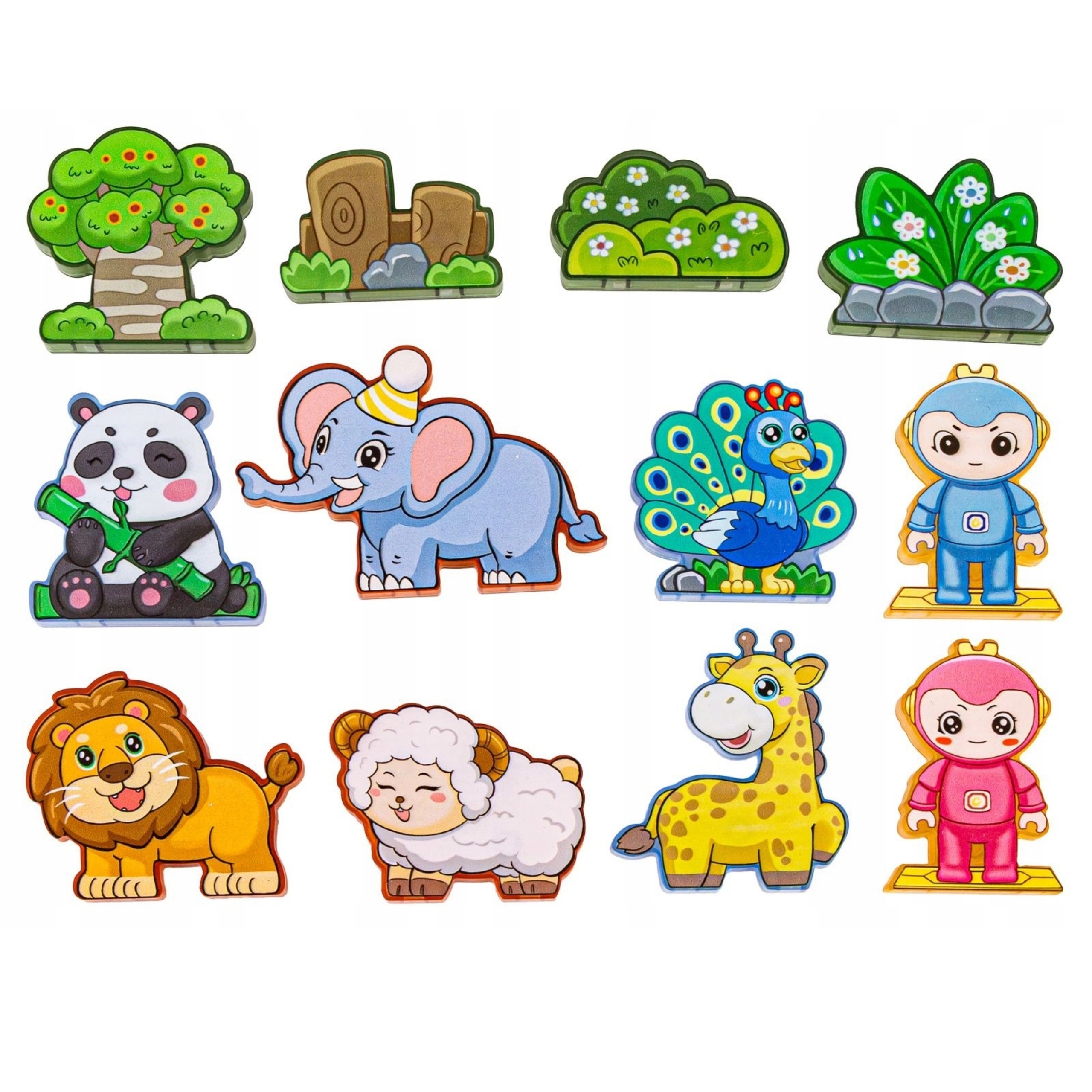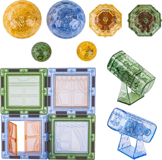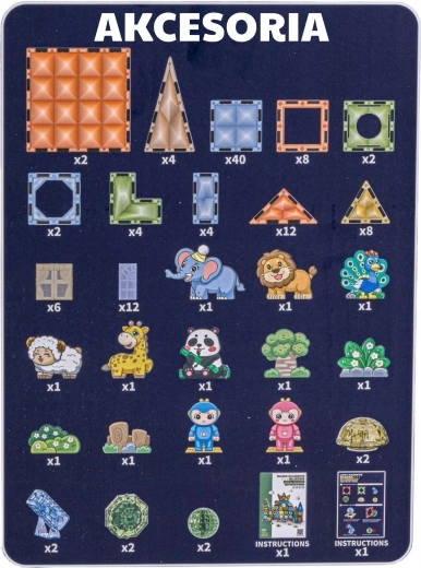 • Alsidige dele: magnetiske former, dyrefigurer og karakterfigurer, tematilbehør (træ, klipper).