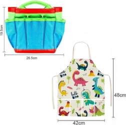Den praktiske forklæde med dinosaurmotiv og værktøjstaske hjælper med at holde orden, mens urtepotter og farverige plantepinde lærer børn at skelne og følge væksten. Sættet er perfekt til leg i haven, på altanen, i sandkassen og ved vandet.
