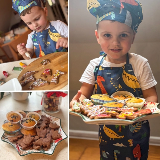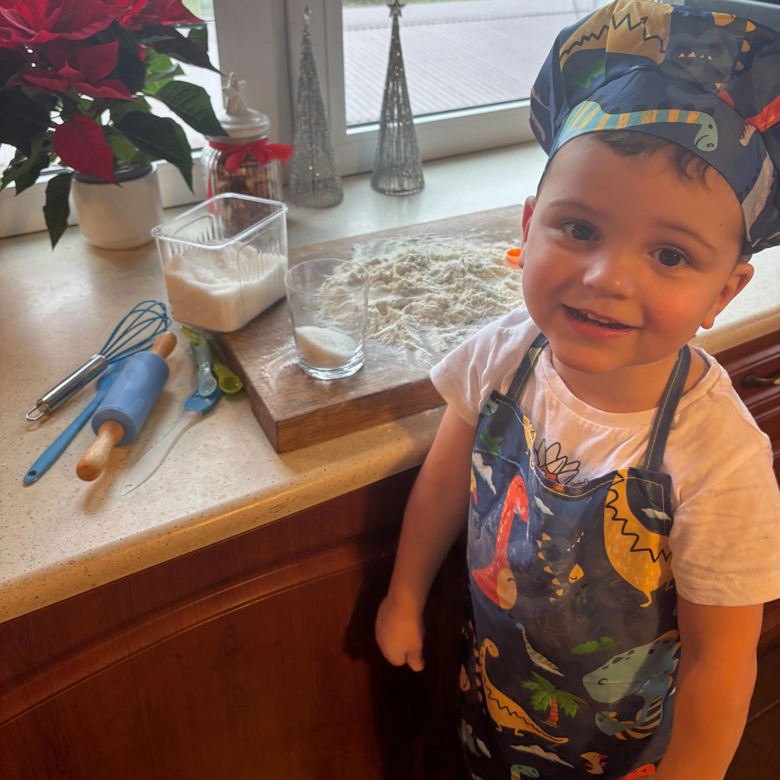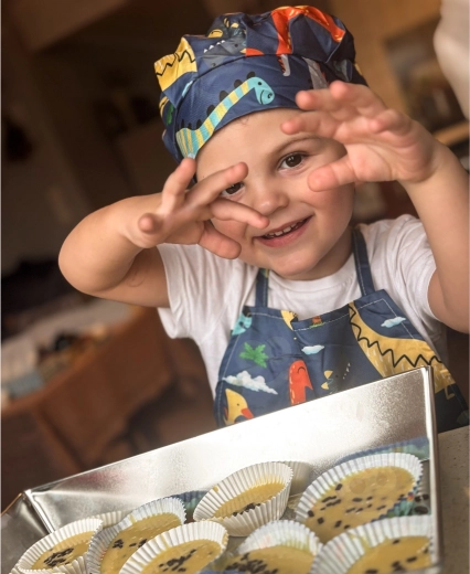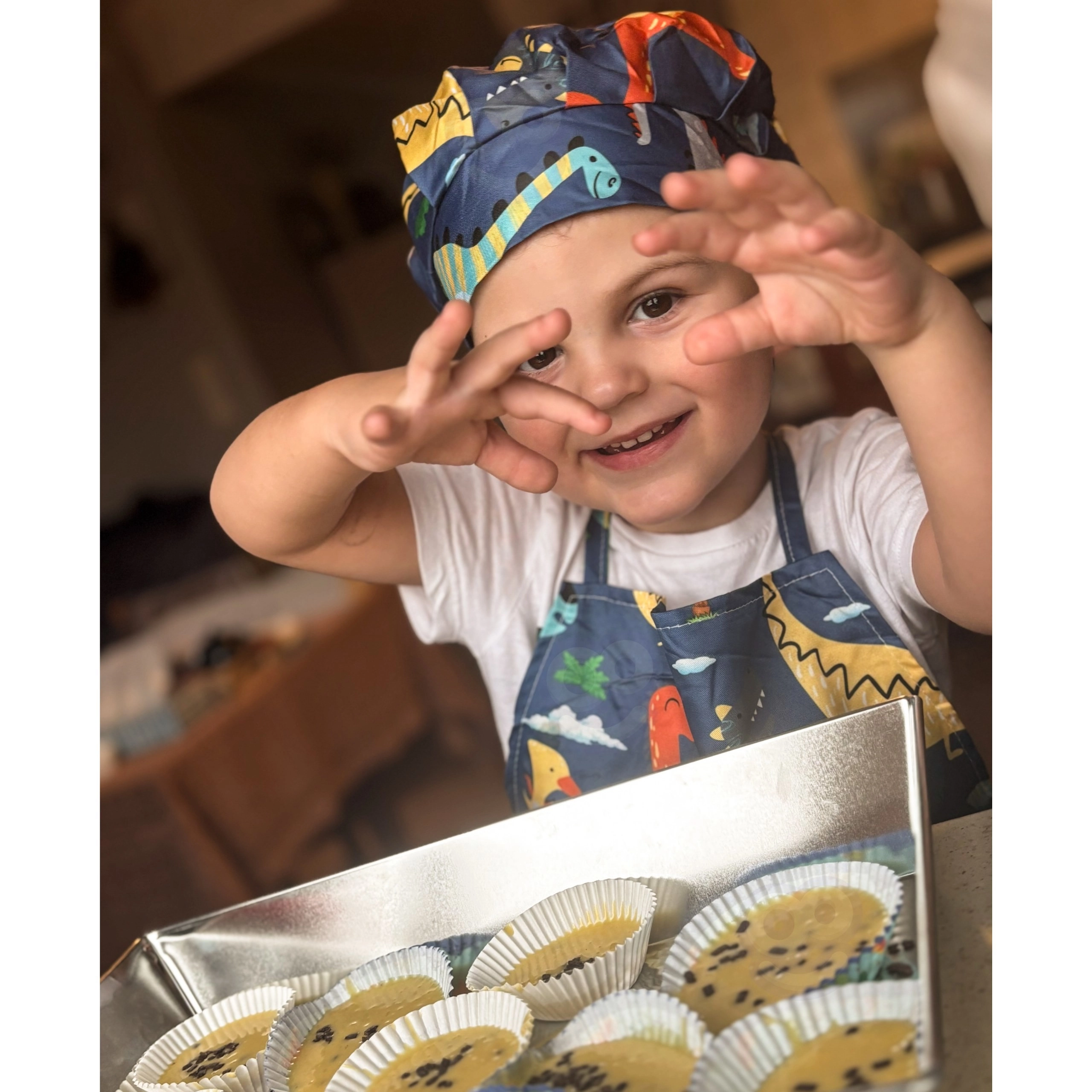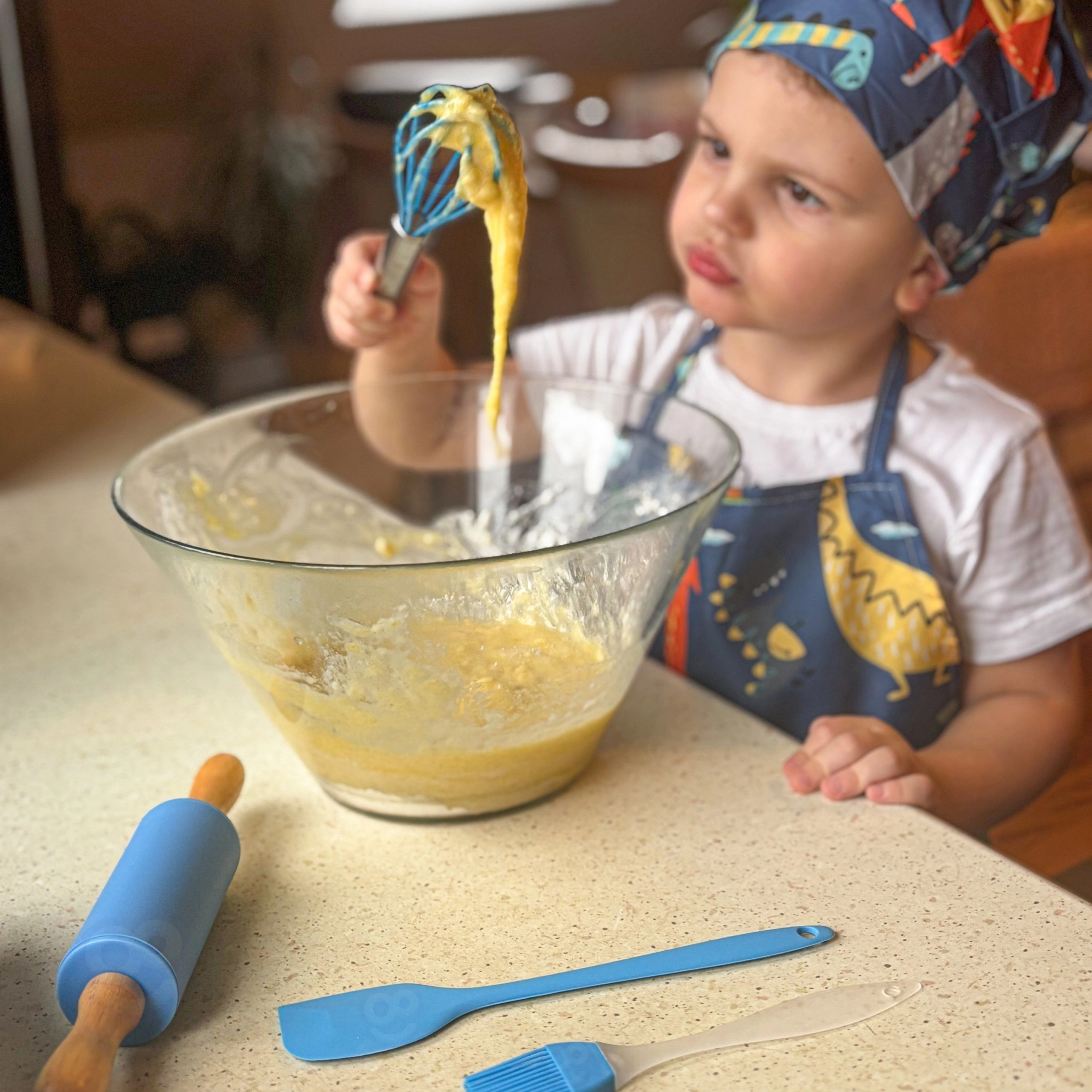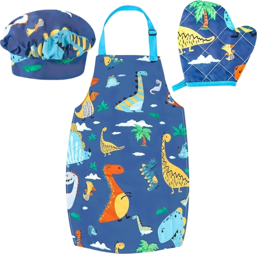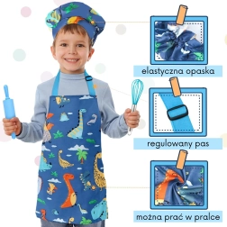Slip børnenes fantasi løs i køkkenet med et sødt dino-tema. Sættet er fremstillet af kvalitetsmaterialer, der er sikre til fødevarer, silikondele er lette at rengøre, og forklæde og hætte kan maskinvaskes. Takket være den justerbare rem og den elastiske snor passer det perfekt til børn i forskellige aldre.
