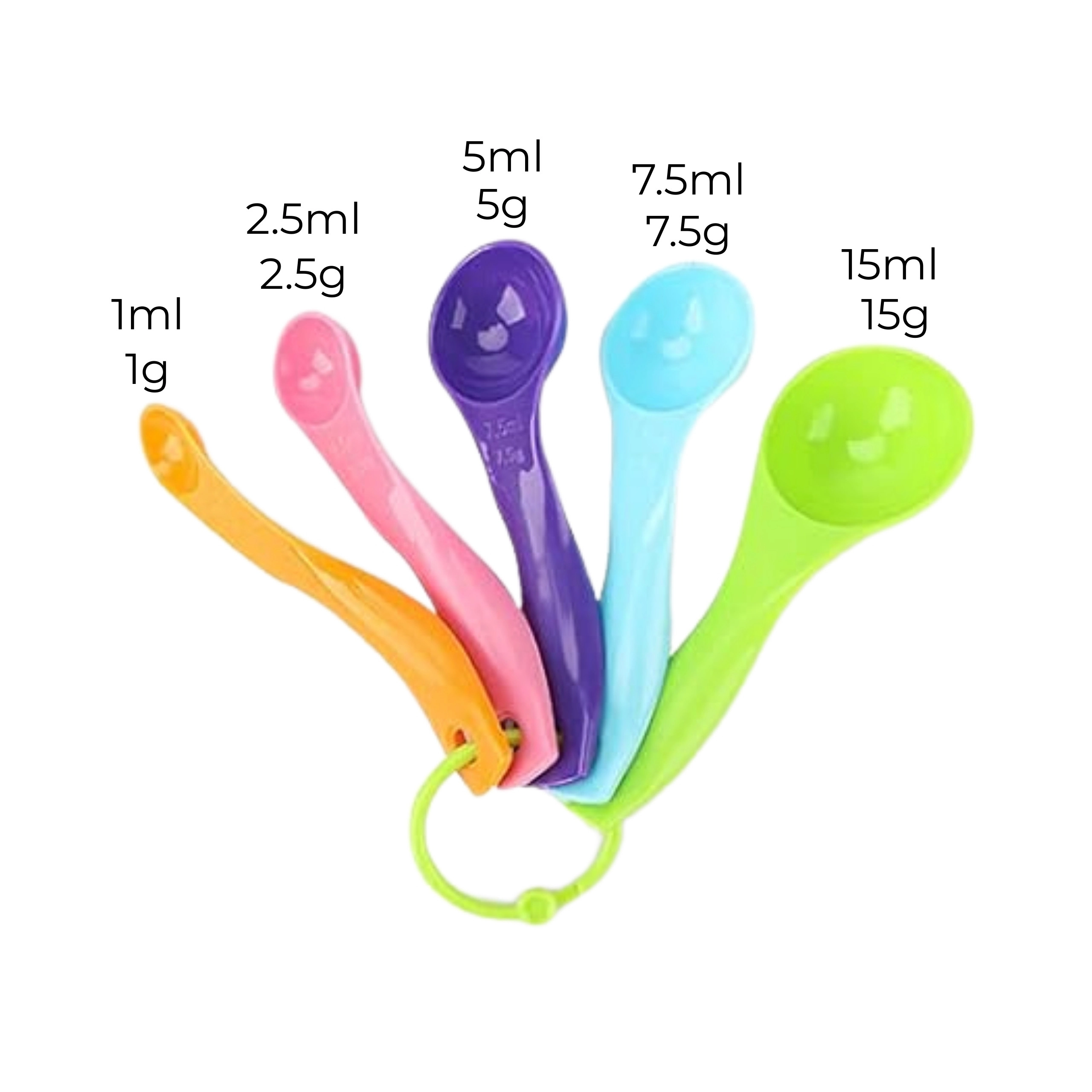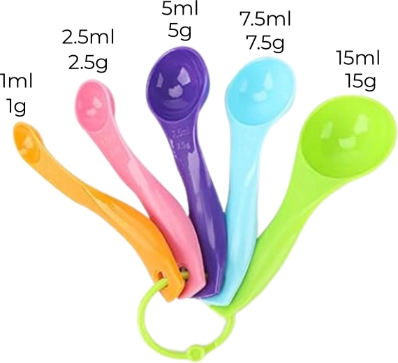 - 5 måleskeer, 6 udstikkere, 12 sprøjteposer
