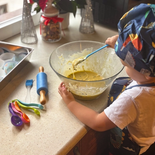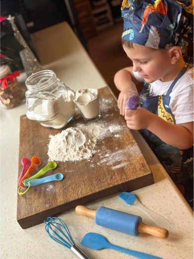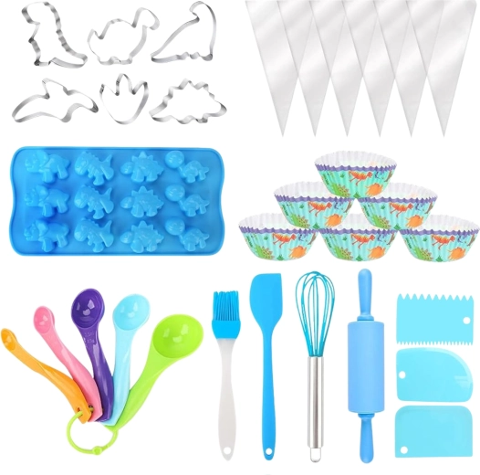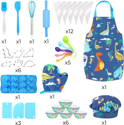 Det komplette udstyr til røring, udrulning, bagning, pyntning og opmåling understøtter selvstændighed, kreativitet, logisk tænkning og finmotorik. De levende farver og de venlige dinosaur-illustrationer bringer endnu mere glæde ind i køkkenet.