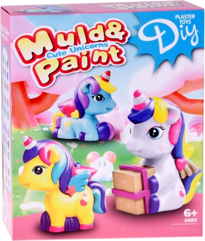 Pakkens indhold: 3 poser gips, 3 forme til enhjørninger, 2 målebægre, 1 palet/skål til blanding af farver, 8 farver, 2 pensler, 1 plastikkniv. Tip: For en glat støbeoverflade, rør gipsen til den er helt opløst og bank forsigtigt på formen for at fjerne luftbobler.