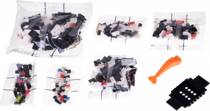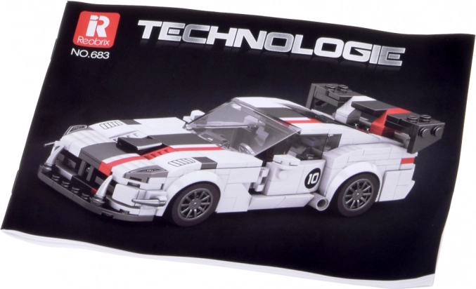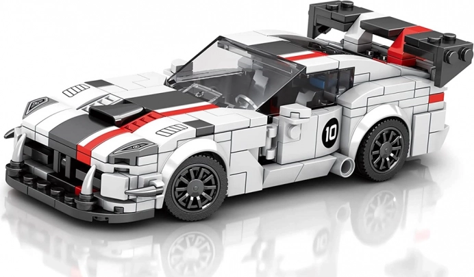 Det tekniske byggesæt af en hvid supersportsvogn med en markant sort‑rød stribe fra motorhjelmen over taget til spoileren giver en fremragende byggeoplevelse og en imponerende færdig model. De lange proportioner, den lave karrosseri og kraftige skærme understreger det muskuløse, racerprægede look.