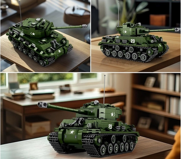 Reobrix SHERMAN M4A3E8 – licenseret WORLD OF TANKS byggesæt. 836 dele, målestok 1:30, tårn 360°, åbneluger og realistiske detaljer.