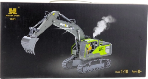 Realistisk RC-gravemaskine HUINA i skala 1:18 tilbyder 13-kanals 2,4 GHz-styring, 680° rotation, metalskovl, LED-belysning og effektfuld damp for maksimal legeoplevelse både inde og ude.