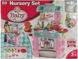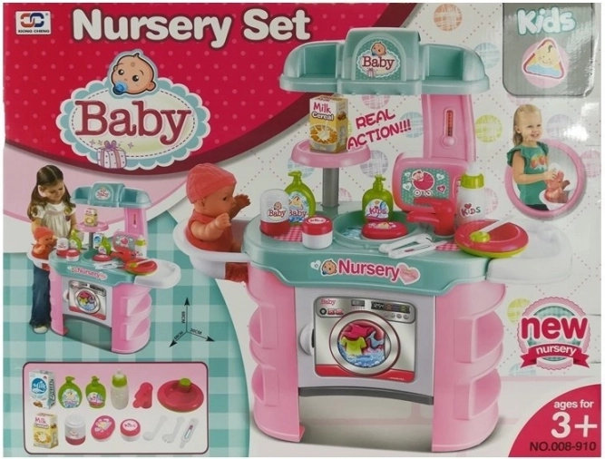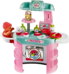 Giv børn en realistisk rolleleg som forældre med et sæt til babypleje. Sættet indeholder et bord med “vaskemaskine”, vask med vandhane, stol til dukke og praktiske hylder. Det rige tilbehør som baby“kosmetik”, legebestik og karton“madvarer” stimulerer fantasien og udvikler færdigheder.