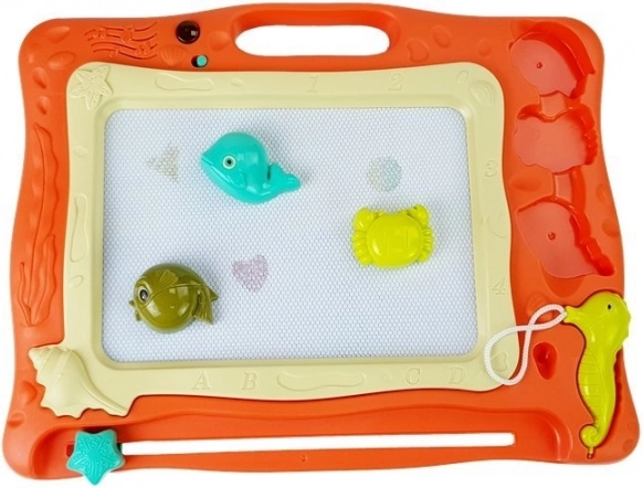 Medfølger gør 4 hav-stempler, som skaber attraktive former. Når du trykker på ON-knappen, afspiller tavlen lydeffekter, og en LED-diode i den øverste del aktiveres. Et fremragende redskab til at udvikle fantasien og træne tegning og skrivning uden papir.