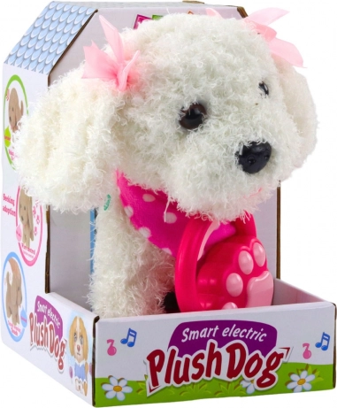 Denne interaktive hund lavet af behagelig, blød plys er perfekt til både hygge og rolleleg. Med den medfølgende line formet som en pote kan du tage hunden med på “gåture”, hvor den vil trave og lave lyde som en rigtig hvalp. Den lyserøde tørklæde med prikker og de søde sløjfer giver legetøjet et charmerende udseende.