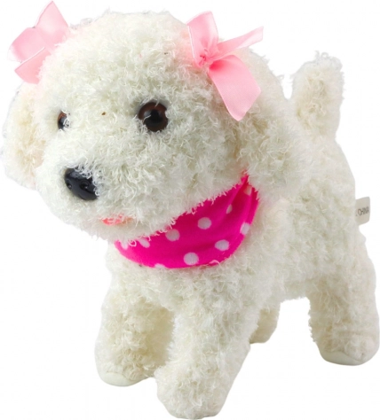 Den søde hvide puddel på line er den ideelle ledsager til børn, der ønsker sig deres egen kæledyrsvens. Den er lavet af blødt plys og kan gå, gø og reagere på kælen, så legen bliver realistisk og fuld af glæde.