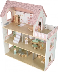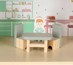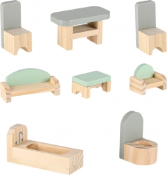 Inkluderer seng, skab, sofagruppe, bord med stole samt badeværelsesudstyr. To træfigurer stimulerer rolleleg og kreativitet.