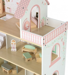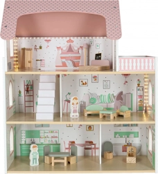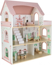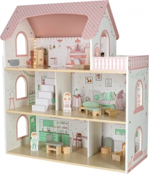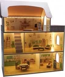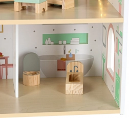 Dukkehuset Lulilo Peonio er et smukt treetagers hus i rosa–mint kombination med trykte interiører, trappe og balkon. De varme LED-lys skaber en magisk aftenstemning og gør hvert rum ekstra hyggeligt. Med det rige møbelsæt kan børn nemt indrette soveværelse, stue, køkken og badeværelse.