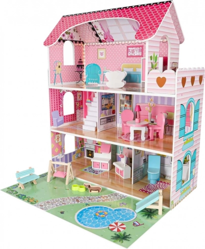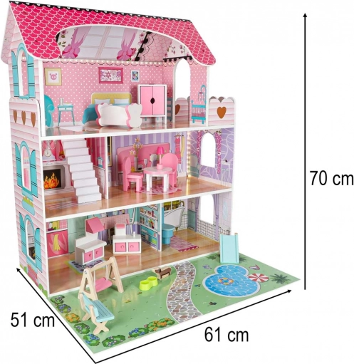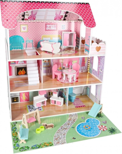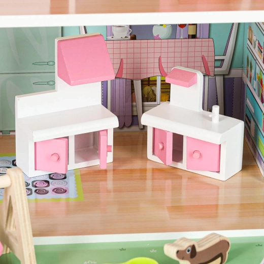 Det rige tilbehør omfatter bord, 2 stole, gynge, toilet, liggestol, bænk, barneseng, lampe, hundeskål, garderobe, komfur og håndvask samt en sød hundefigur. Takket være den robuste MDF-konstruktion, plasttilbehør og metalskruer er huset stabilt og modstandsdygtigt over for daglig leg.