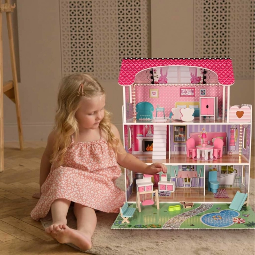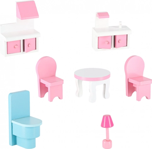 Ideelt som gave til børn, der elsker fantasi, rollelege og at arrangere møbler. Det rosa-hvide design med fine detaljer passer flot på børneværelset og styrker finmotorik og fantasi.