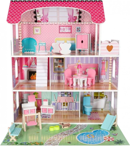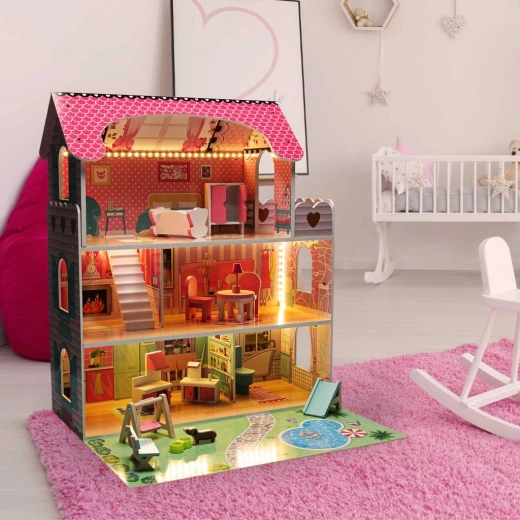 Trædukkehus med LED-belysning og have 70 cm rosa