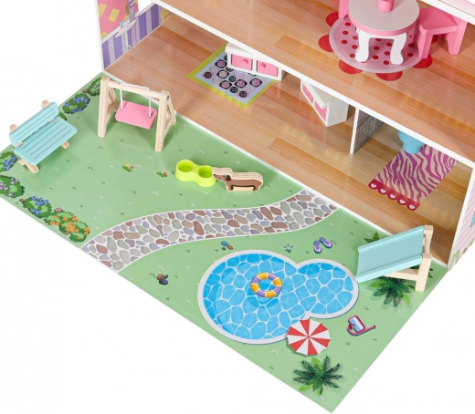 Tre etager, altan, trappe og have med legeplads. Børn kan frit flytte rundt på møblerne og skabe uendelige legescenarier.