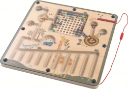Denne magnetiske legetavle i træ med søde dyr er ideel til leg derhjemme, i daginstitutioner og legehjørner. Børn fører de farvede kugler gennem fræsede stier ved hjælp af magnetpennen, som sidder fast med en snor – de lægger simple billeder efter 5 skabeloner, matcher kuglerne til de rigtige dyr og sorterer dem i beholdere fra den mindste til den største.