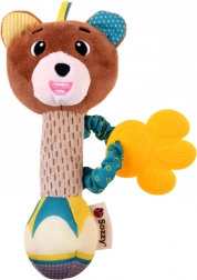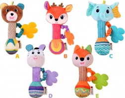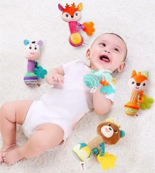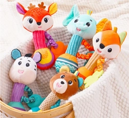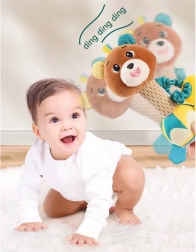 Bløde tekstiler og et rillet håndtag gør det nemt at holde og ryste, hvilket understøtter finmotorik og hånd-øje-koordination.