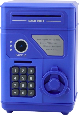 En sjov og lærerig sparebøsse i form af et elektronisk pengeskab lærer børn at spare og håndtere penge. Den tilbyder tastatur med PIN-kode, automatisk indføring af sedler og sikker opbevaring af mønter og kontanter. Et kreativt element i form af en klistermærke, der imiterer Face ID, stimulerer fantasien og gør det at spare penge til en sjov leg.