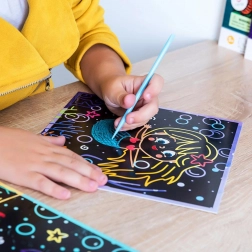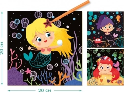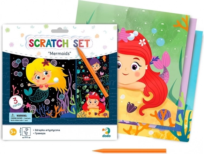DODO-sættet med skrabebilleder giver børn både underholdning og færdighedstræning i ét. Takket være det farvede lag nedenunder kommer de farverige havfruemotiver gradvist til syne, når man skraber, hvilket begejstrer børnene.