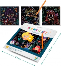 I pakken finder du tre kvadratiske kort i størrelsen 20 × 20 cm samt en praktisk skrabepind. Børn kan følge de angivne linjer eller slippe fantasien løs og skabe en original undervandsverden.