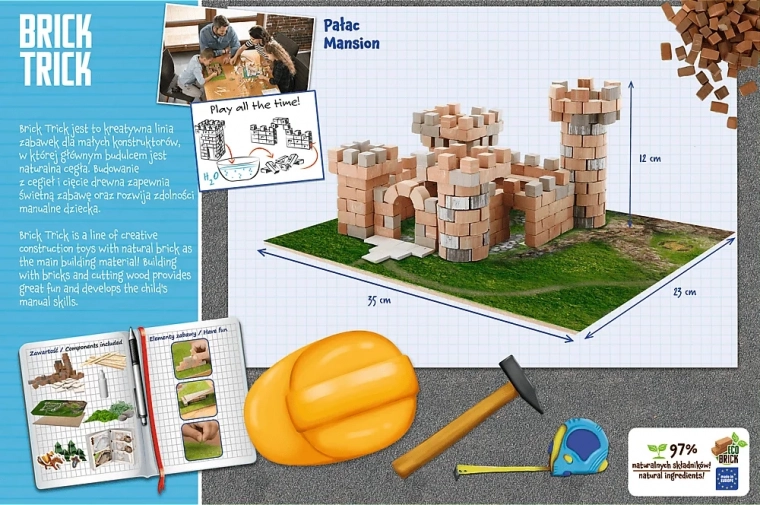Bliv bygmester og byg dit eget slot XL af ægte lersten og træplanker. Byggesættet TREFL BRICK TRICK udvikler manuelle færdigheder, kreativitet og koncentration, og takket være vandopløseligt lim kan det bruges igen og igen. Følg vejledningen, eller skab din helt egen løsning og fuldend byggeriet med de medfølgende dekorationer og figurer.