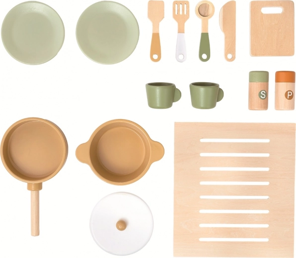Der medfølger et rigt sæt tilbehør: tallerkener, krus, pande, gryde med låg, salt og peber, skærebræt, køkkenredskaber og rist til ovnen. Konstruktion af massivt træ og ugiftige farver sikrer sikkerhed og lang holdbarhed.