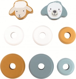 Denne træbalanceleg byder på sjov stabling af farvede ringe og dyrehoveder på to pinde. Platformen vipper ved hver bevægelse, og børn afprøver, hvordan de kan samle fåret og hunden, så alt forbliver i balance. Under legen udvikler de tålmodighed, logisk tænkning og sans for balance.