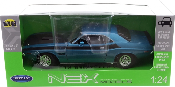 Detaljeret metal-plast model af bilen 1970 DODGE CHALLENGER T/A i skala 1:24, som vil glæde både samlere og yngre entusiaster. Den tilbyder åbningsbare karrosseridele og en kvalitets sprøjtelakeret autolak, der trofast gengiver de originale nuancer.