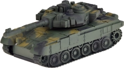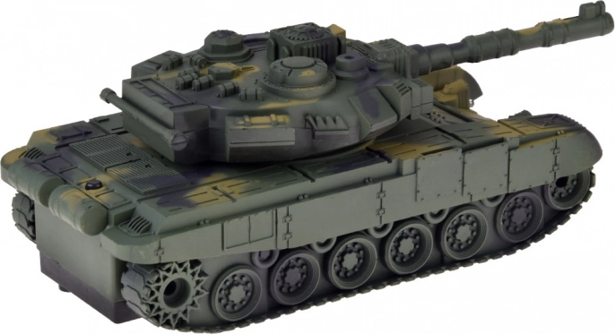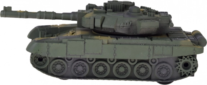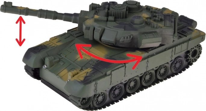 RC-kampvognen i grøn camouflage efterligner trofast ægte militærteknik og tilbyder jævn kørsel frem/tilbage, drejning på stedet samt manuel 360° tårndrejning med ledsagende mekanisk lyd. Lyseffekter og realistiske skydelyde forstærker kampstemningen både inde og ude.