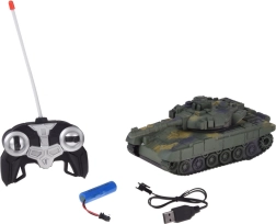 - RC-kampvogn, fjernbetjening med fleksibel antenne, batteri, USB-oplader