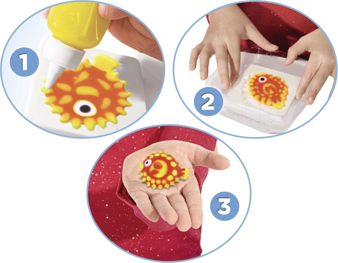 Bland opløsningen, fyld formen med gel og nedsænk den i vand – på et øjeblik dannes en blød 3D-figur klar til leg.