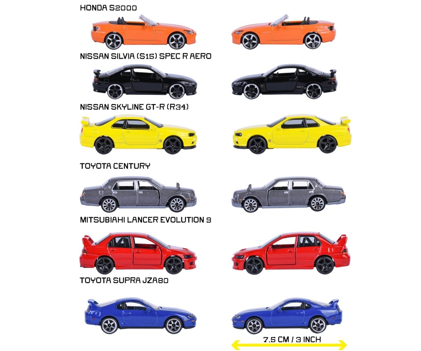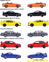 Takket være åbnefunktioner (f.eks. døre, motorhjelm eller bagagerum) og friløbshjul er bilerne fantastiske til leg og som samlerobjekter. I pakken kan du finde en af de populære modeller fra NISSAN, MITSUBISHI, TOYOTA eller HONDA i den begrænsede Japan-serie.