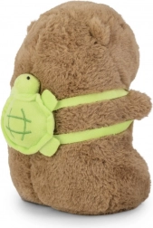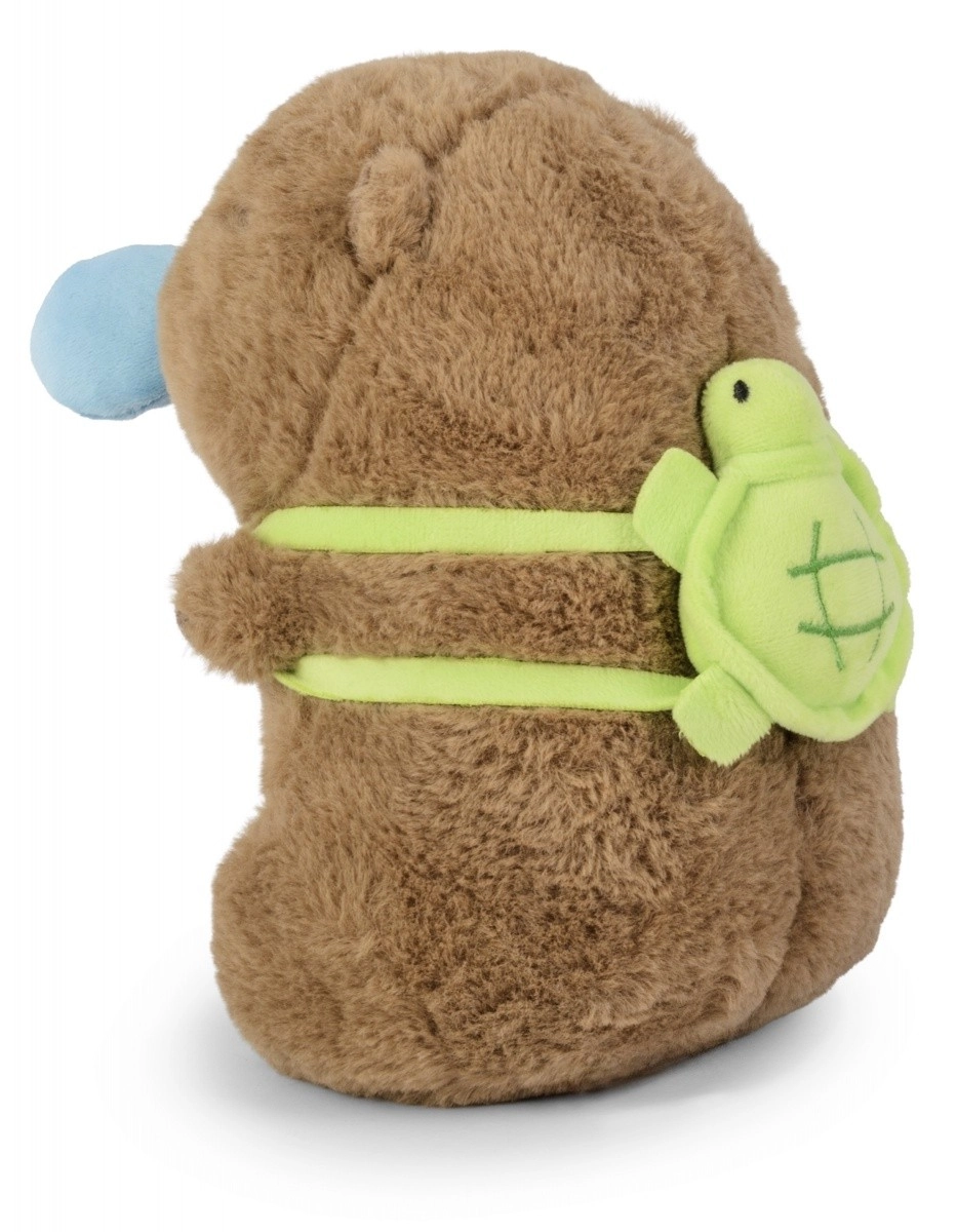 Kapybaraen bærer en blød, grøn “skildpadde” på ryggen, som giver legetøjet karakter og indbyder til fantasifulde historier.