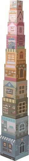Dette charmerende træbyggesæt i blide pastelfarver forvandler enhver leg til et eventyr. Hver af de 10 klodser forestiller en tematisk bybygning – skole, hospital, boghandel, blomsterbutik, supermarked og flere. Børn kan skabe høje tårne og varierede gader og samtidig træne øje–hånd-koordination og rumlig forståelse.