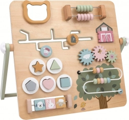 Dette Montessori træ-aktivitetsboard med gårdmotiver tilbyder et bredt udvalg af interaktive elementer: roterende tandhjul, skydende elementer, perle- og trådlabyrint, en lille kugleramme samt indsætningsformer. Alt er overskueligt arrangeret og fremstillet af kvalitetsmaterialer for sikker og langvarig leg.