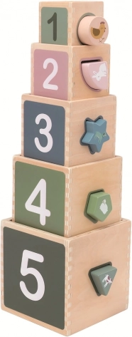 Opdag et sjovt og lærerigt legetøj til de mindste: et sammenklappeligt træ-tårn i bløde pastelfarver med gårdtema. Børn træner finmotorik, logisk tænkning og lærer tal, former og farver gennem leg. Hver af de 5 klodser har søde dyr, lækkerier de spiser, og tal for nem indlæring. Der medfølger også indsætningsformer til sortering og udvikling af koordination.