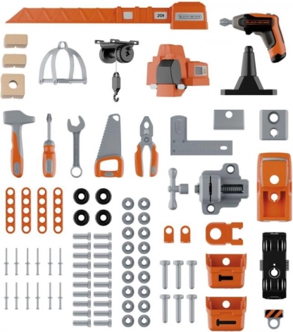 Inkluderet er et bilbyggesæt, som små mekanikere let samler i få trin. Værkstedet indeholder hammer, hjulnøgle, skruetrækker, flad-/gaffelnøgle, tang, sav, stor tvinge og skydelære samt skruer, møtrikker, søm og befæstelseselementer. Kompatibelt og udvideligt med alle BLACK+DECKER-værktøjer fra mærket Smoby.
