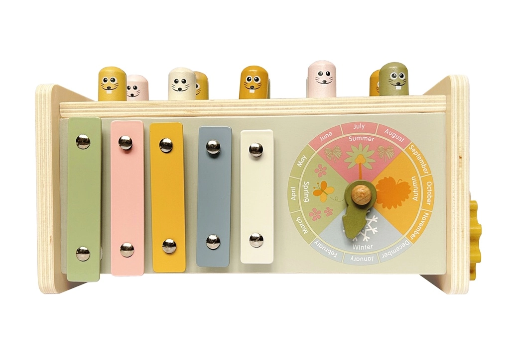 Glade figurer og en træhammer motiverer børn til at øve koordination, slagstyrke og rytme. Den robuste konstruktion tåler daglig leg.